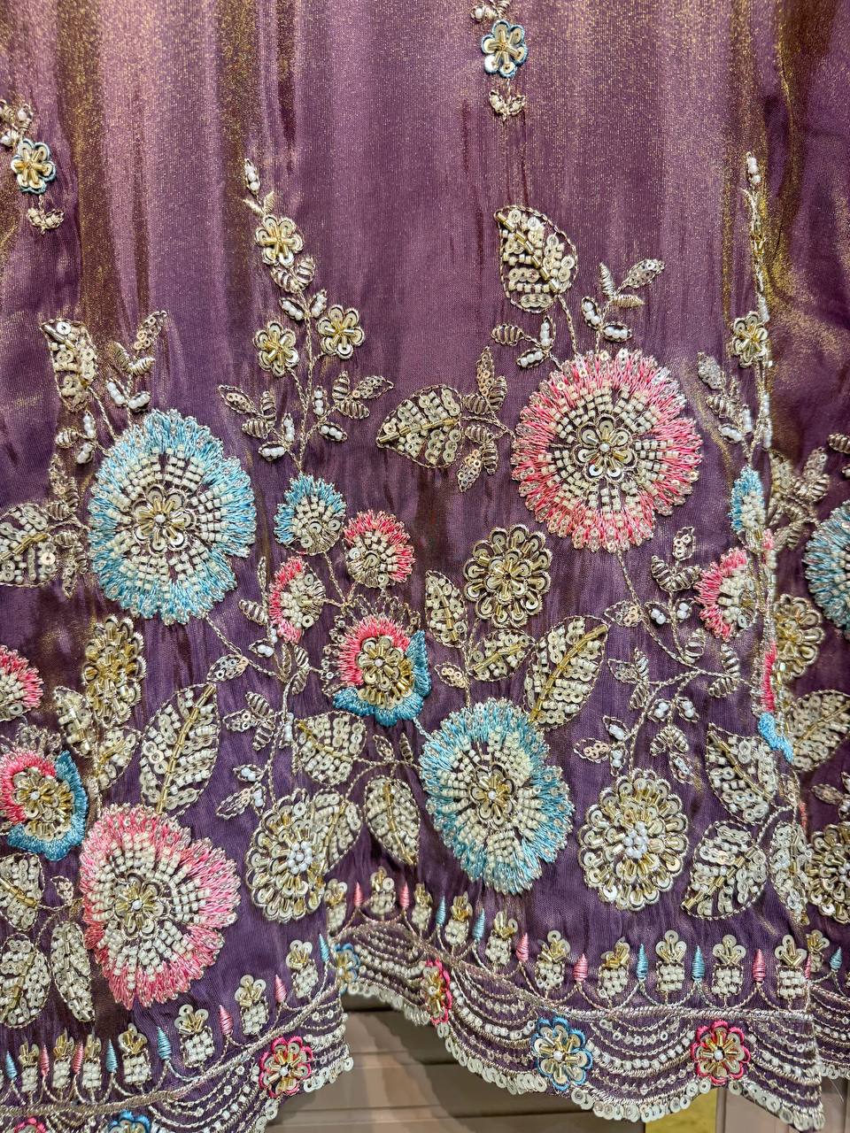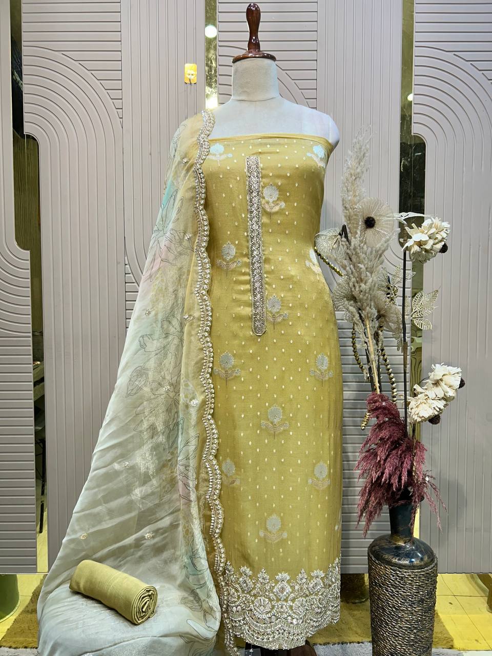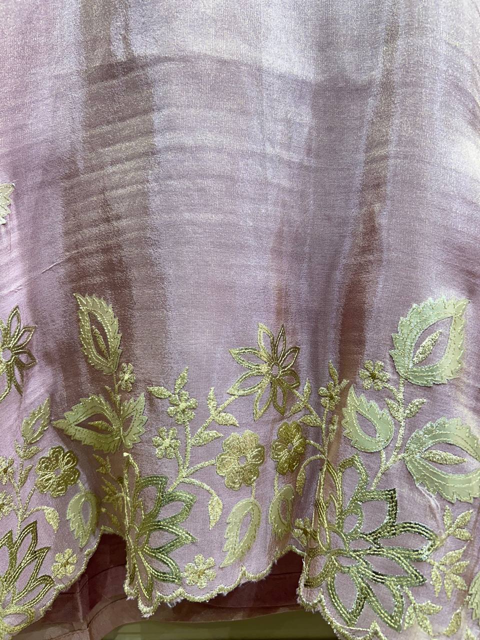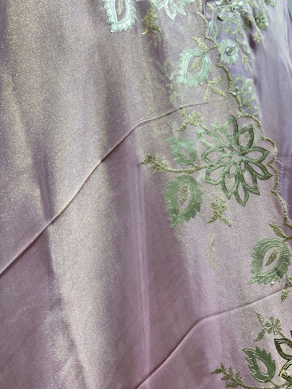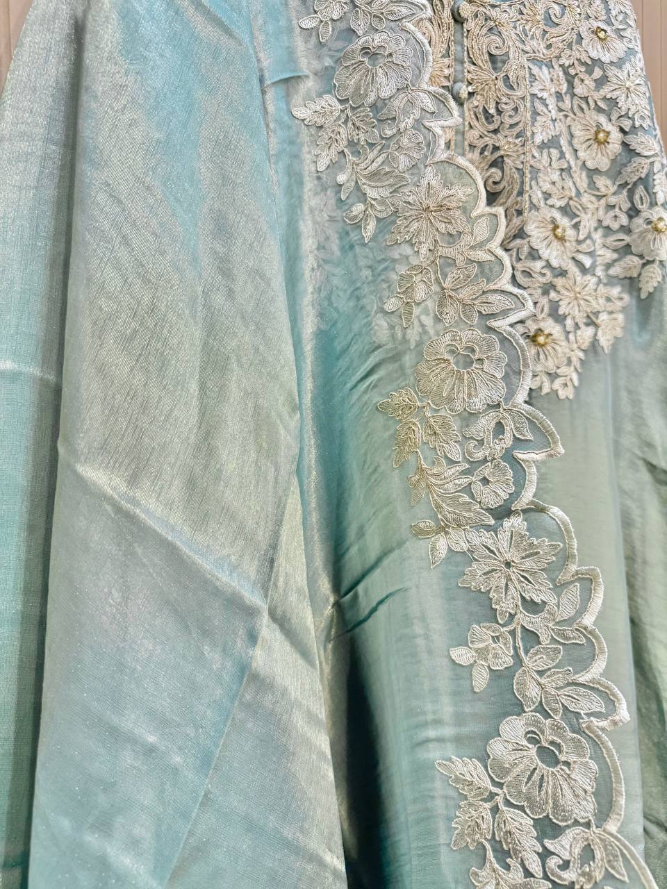 Glass Tissue Fabric Unstitched Suit ek soft, graceful aur luxurious ethnic creation hai, jo delicate glass tissue fabric par beautifully crafted applique work shirt aur dupatta ke saath design kiya gaya hai ✨👗