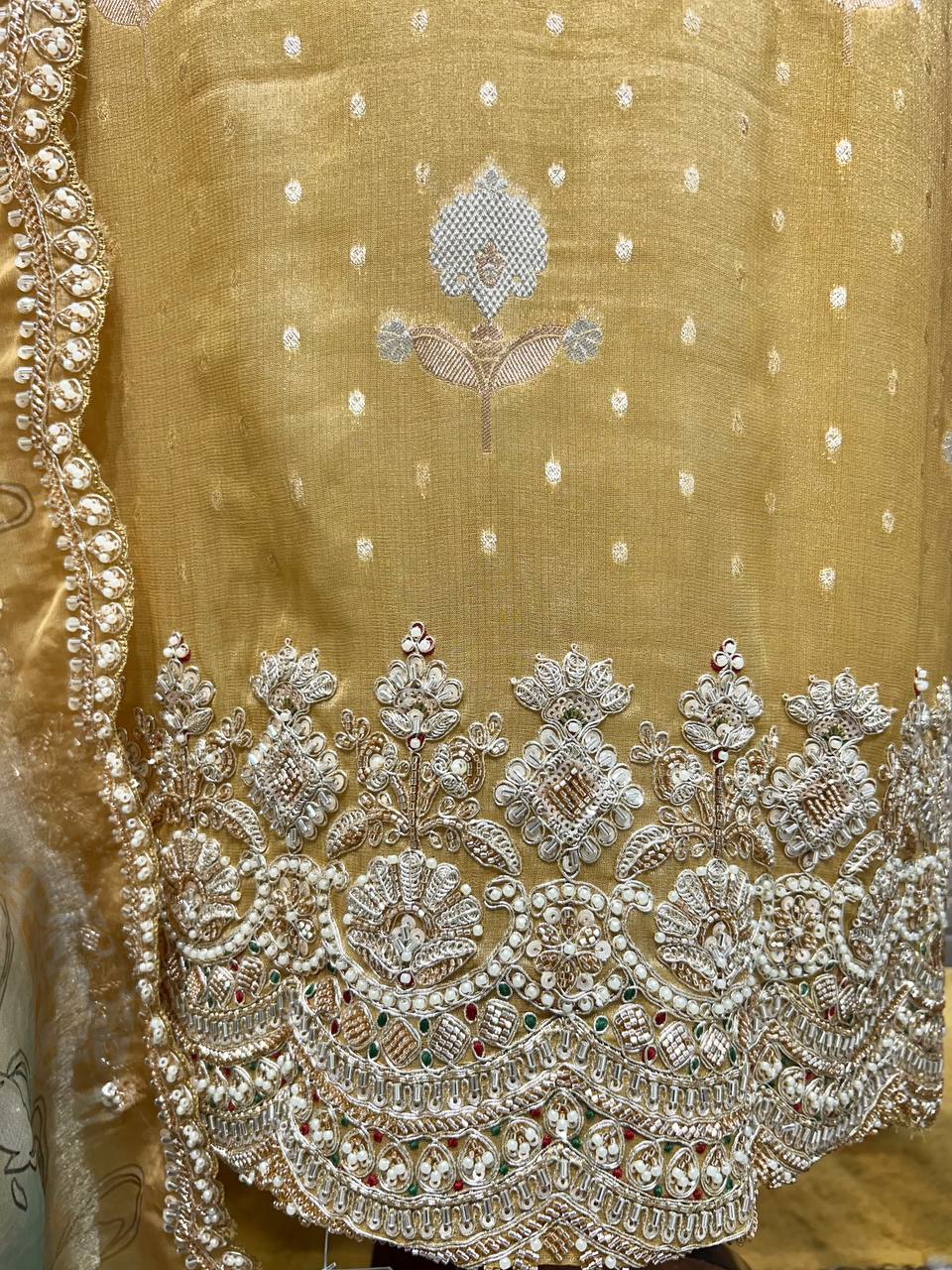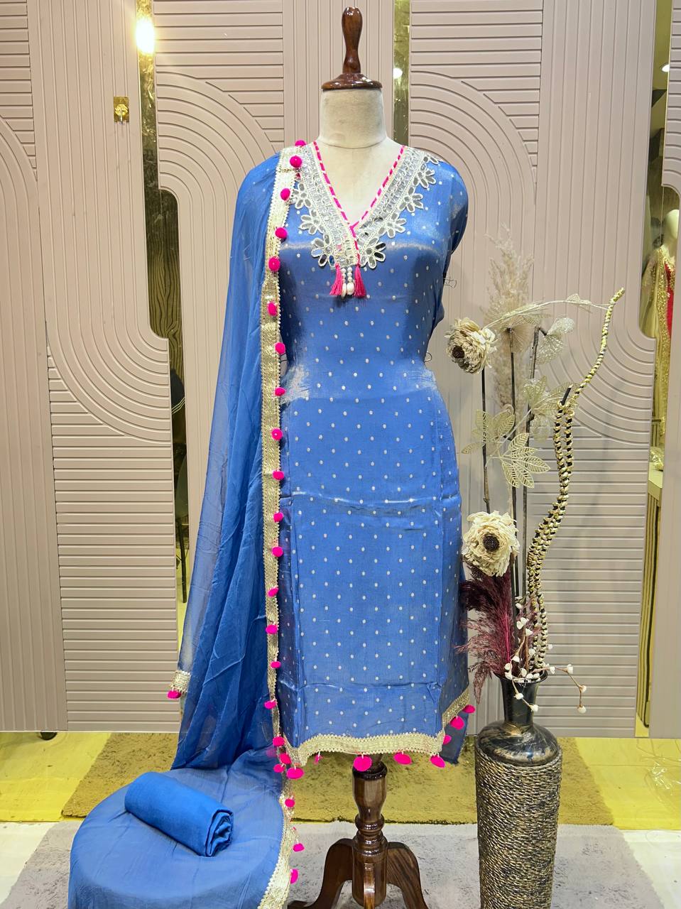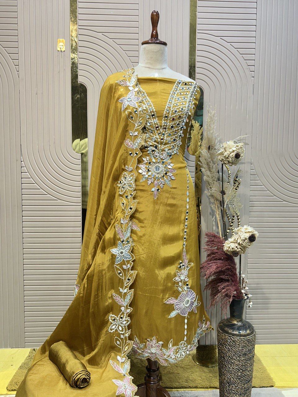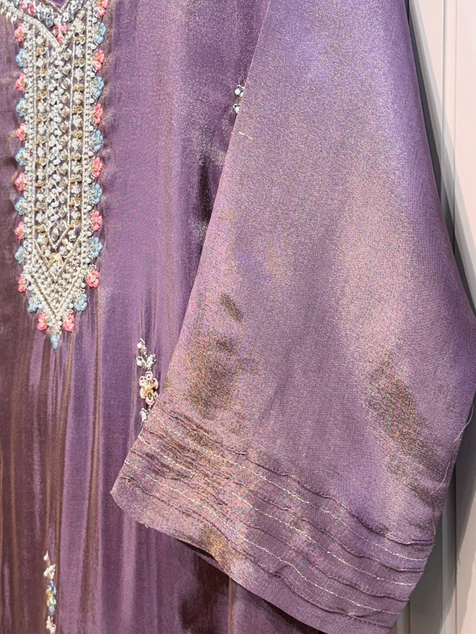 Glass Tissue Fabric Unstitched Suit ek soft, graceful aur luxurious ethnic creation hai, jo delicate glass tissue fabric par beautifully crafted applique work shirt aur dupatta ke saath design kiya gaya hai ✨👗
