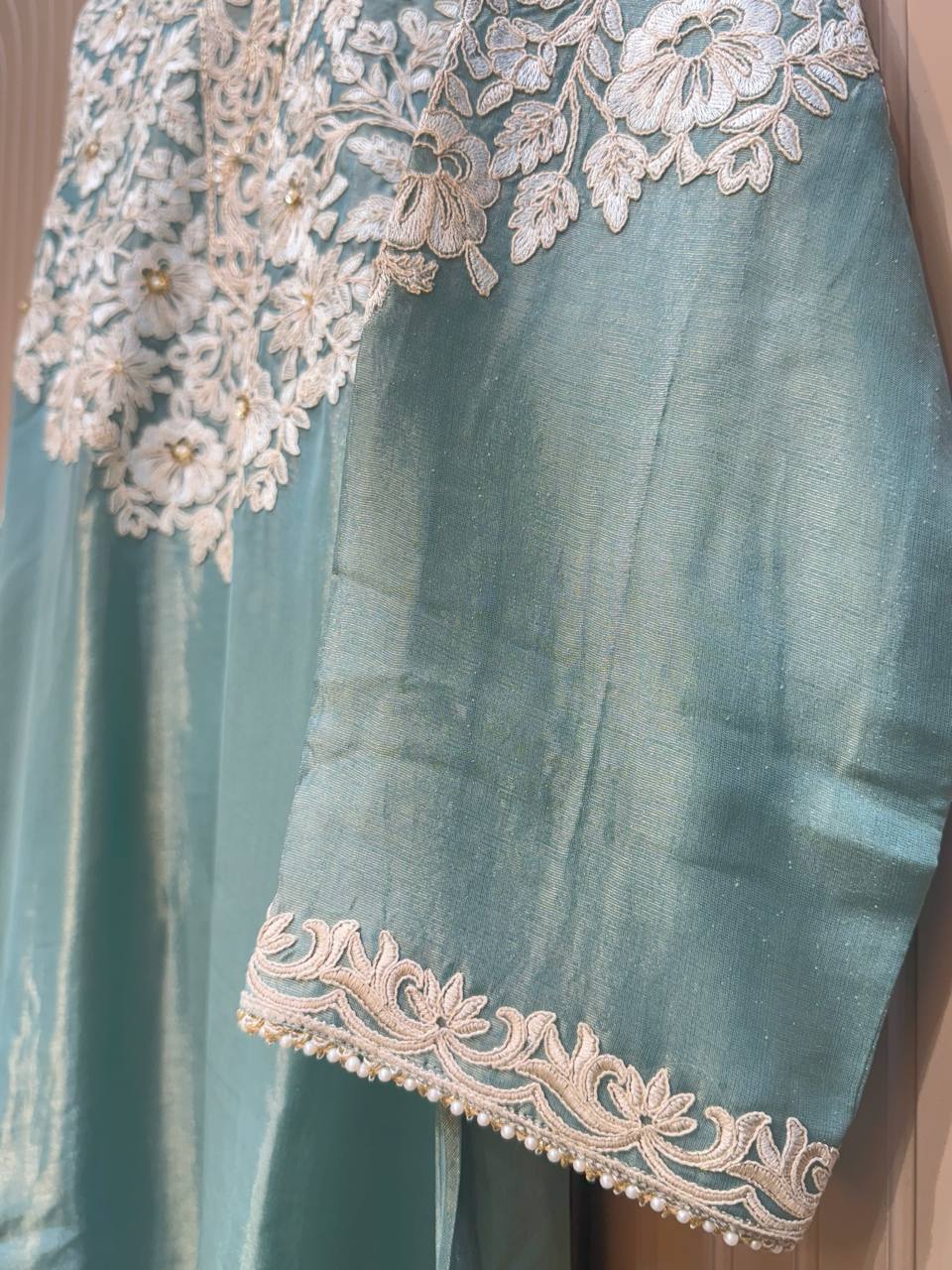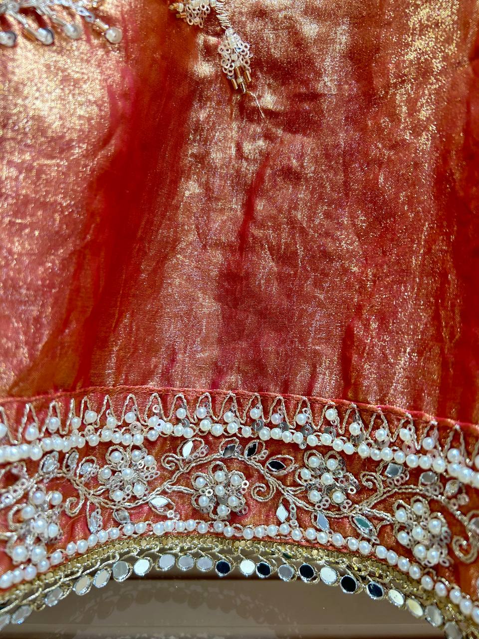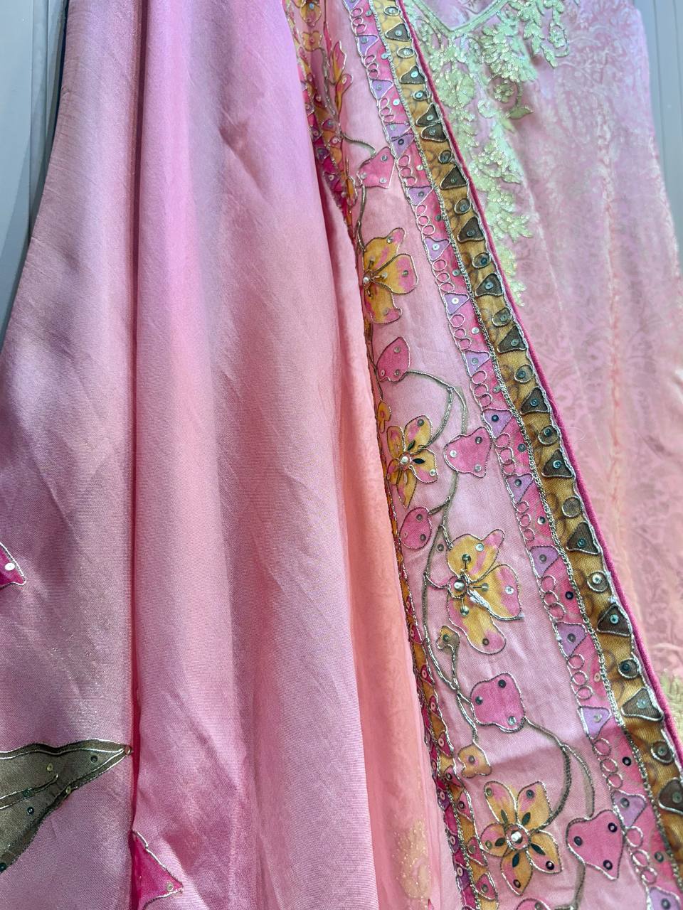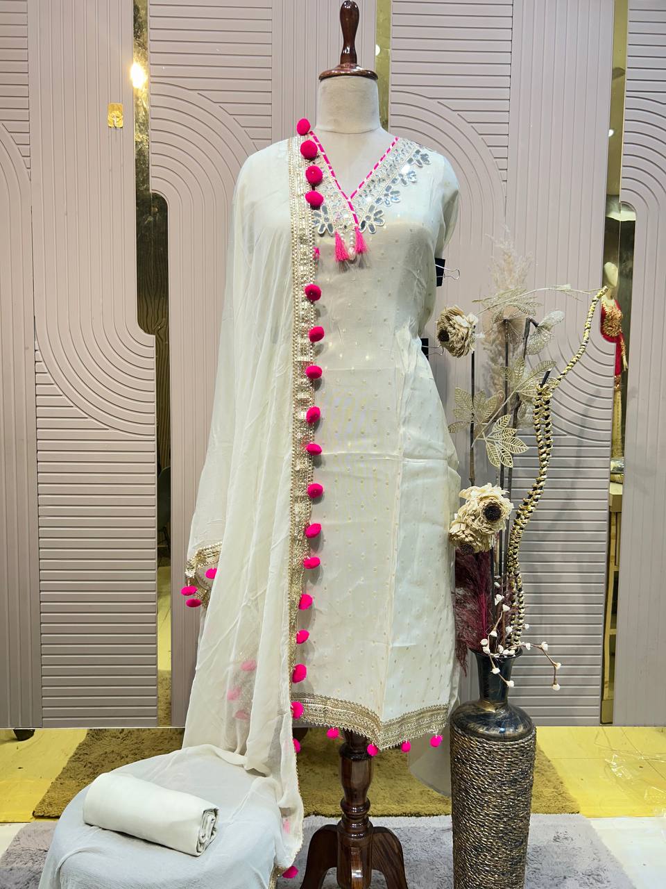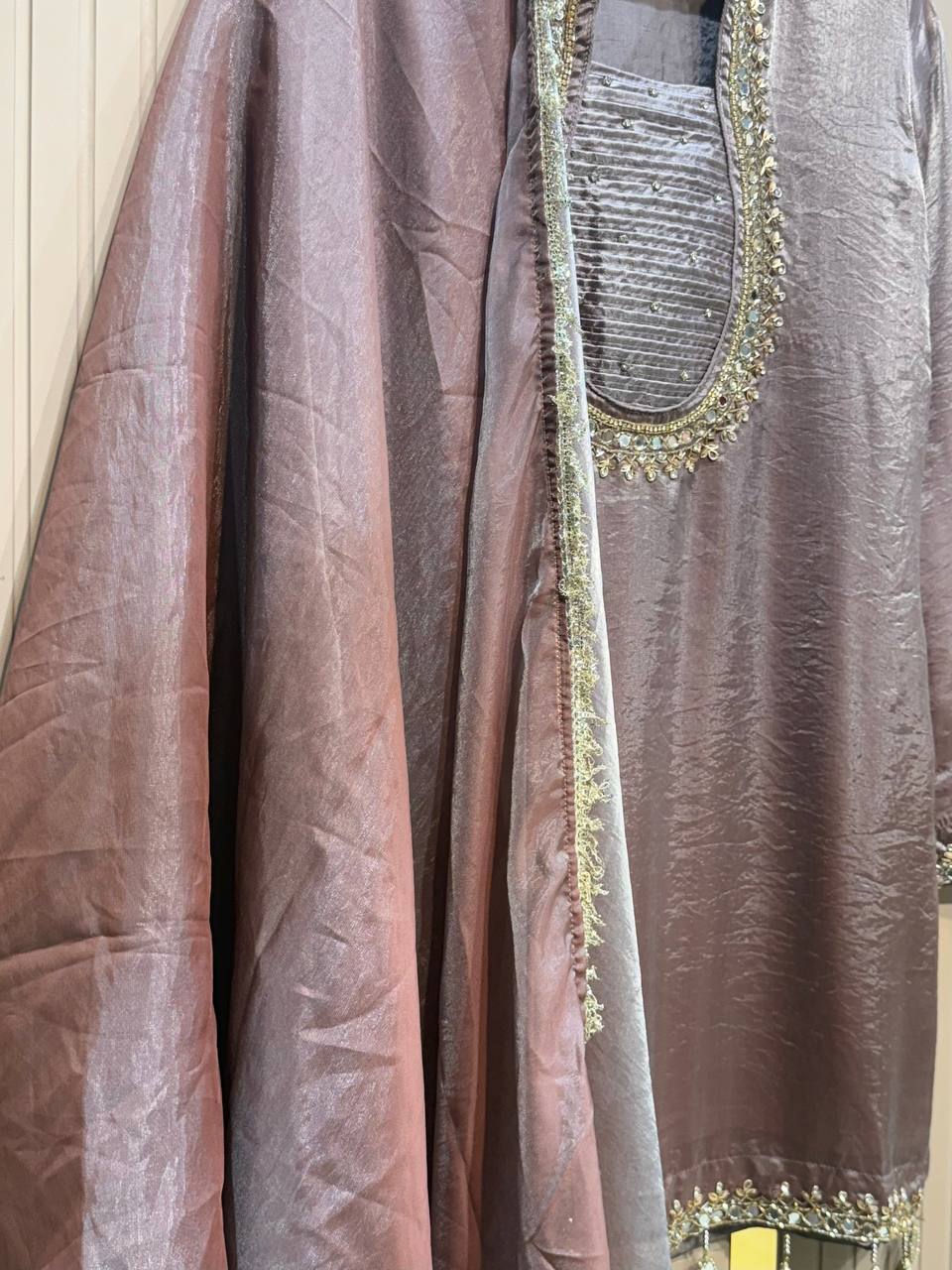 Glass Tissue Fabric Unstitched Suit ek soft, graceful aur luxurious ethnic creation hai, jo delicate glass tissue fabric par beautifully crafted applique work shirt aur dupatta ke saath design kiya gaya hai ✨👗