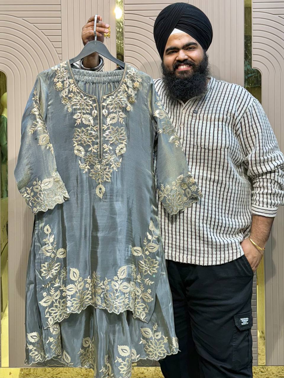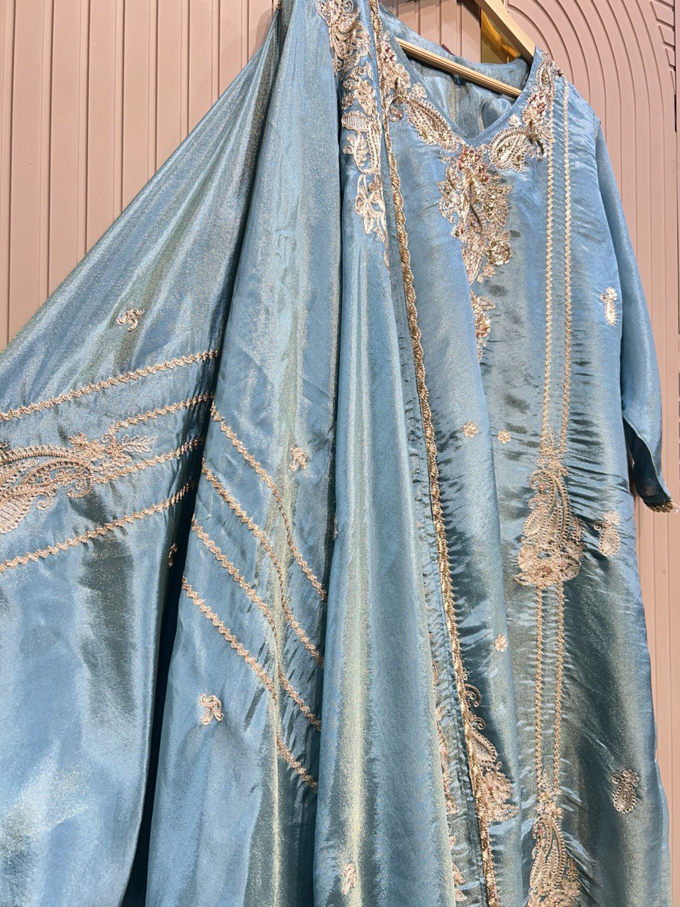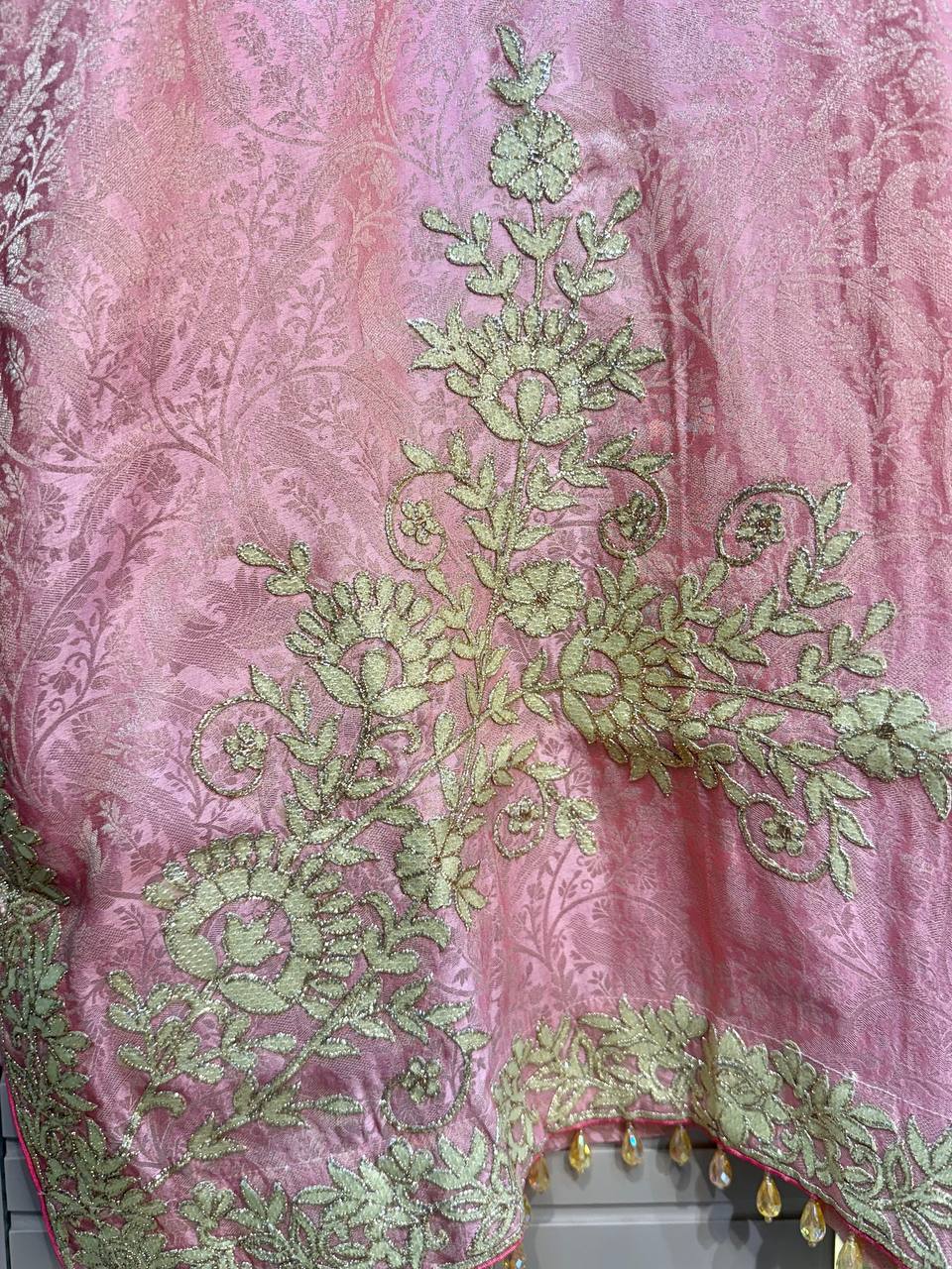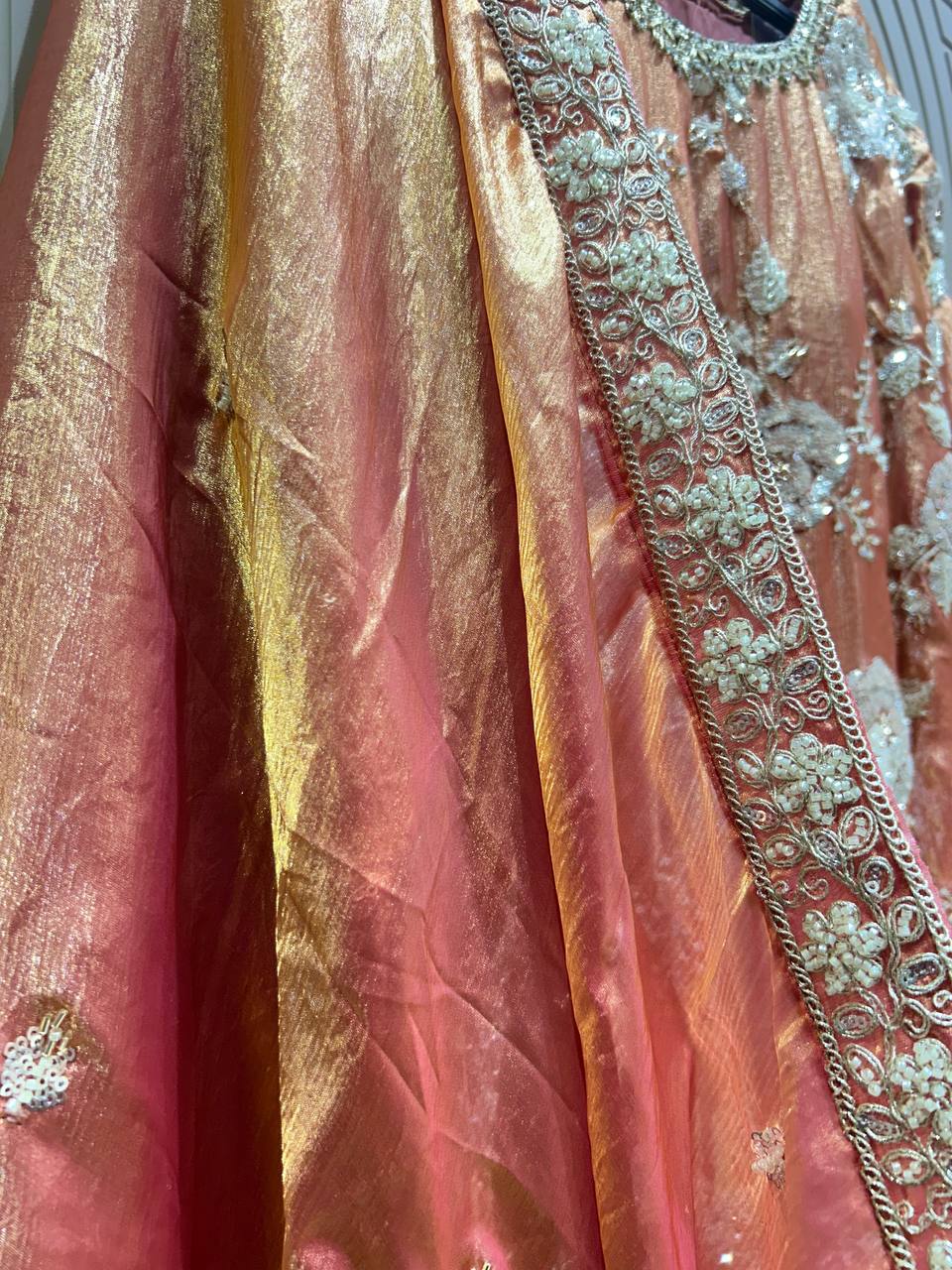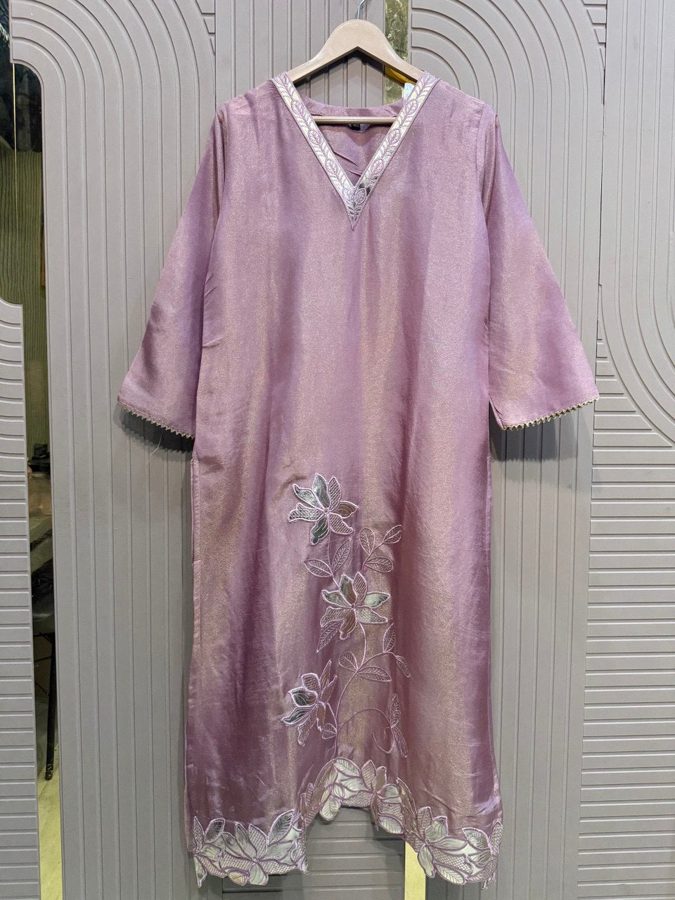 Glass Tissue Fabric Unstitched Suit ek soft, graceful aur luxurious ethnic creation hai, jo delicate glass tissue fabric par beautifully crafted applique work shirt aur dupatta ke saath design kiya gaya hai ✨👗