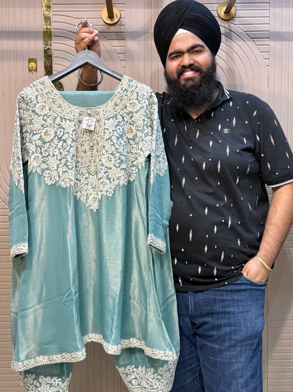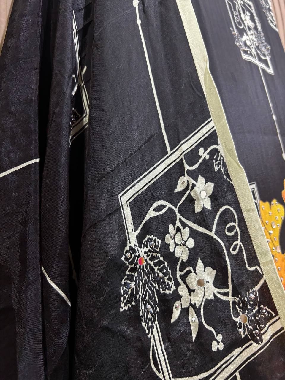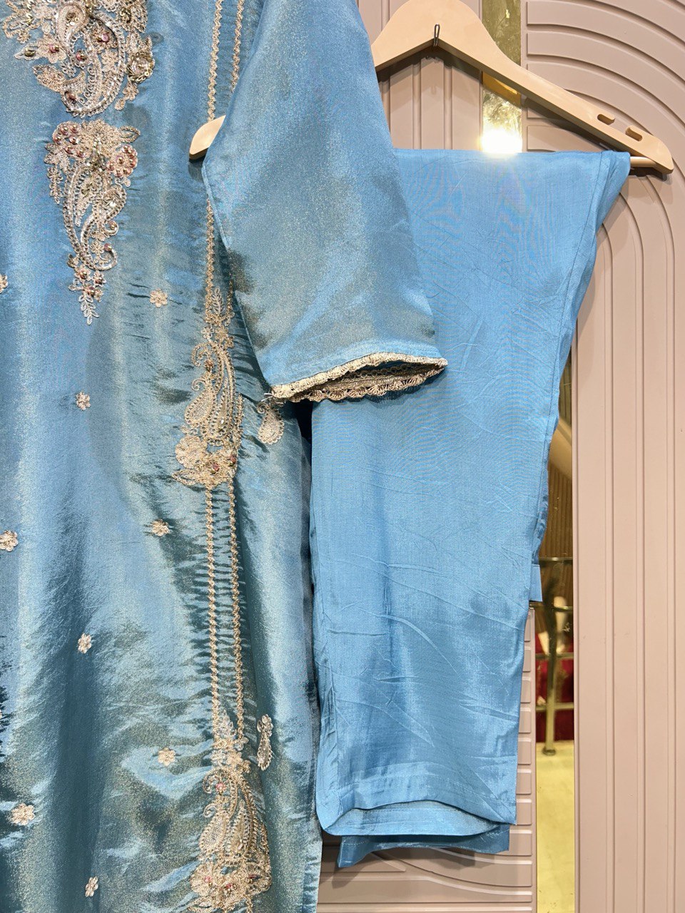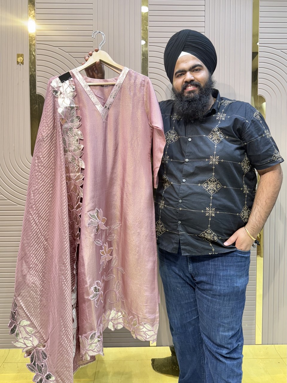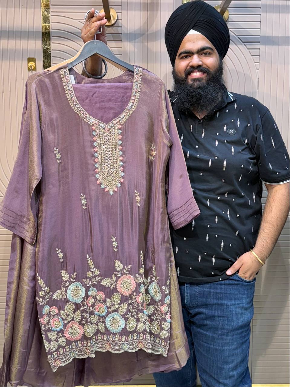 Glass Tissue Fabric Unstitched Suit ek soft, graceful aur luxurious ethnic creation hai, jo delicate glass tissue fabric par beautifully crafted applique work shirt aur dupatta ke saath design kiya gaya hai ✨👗
