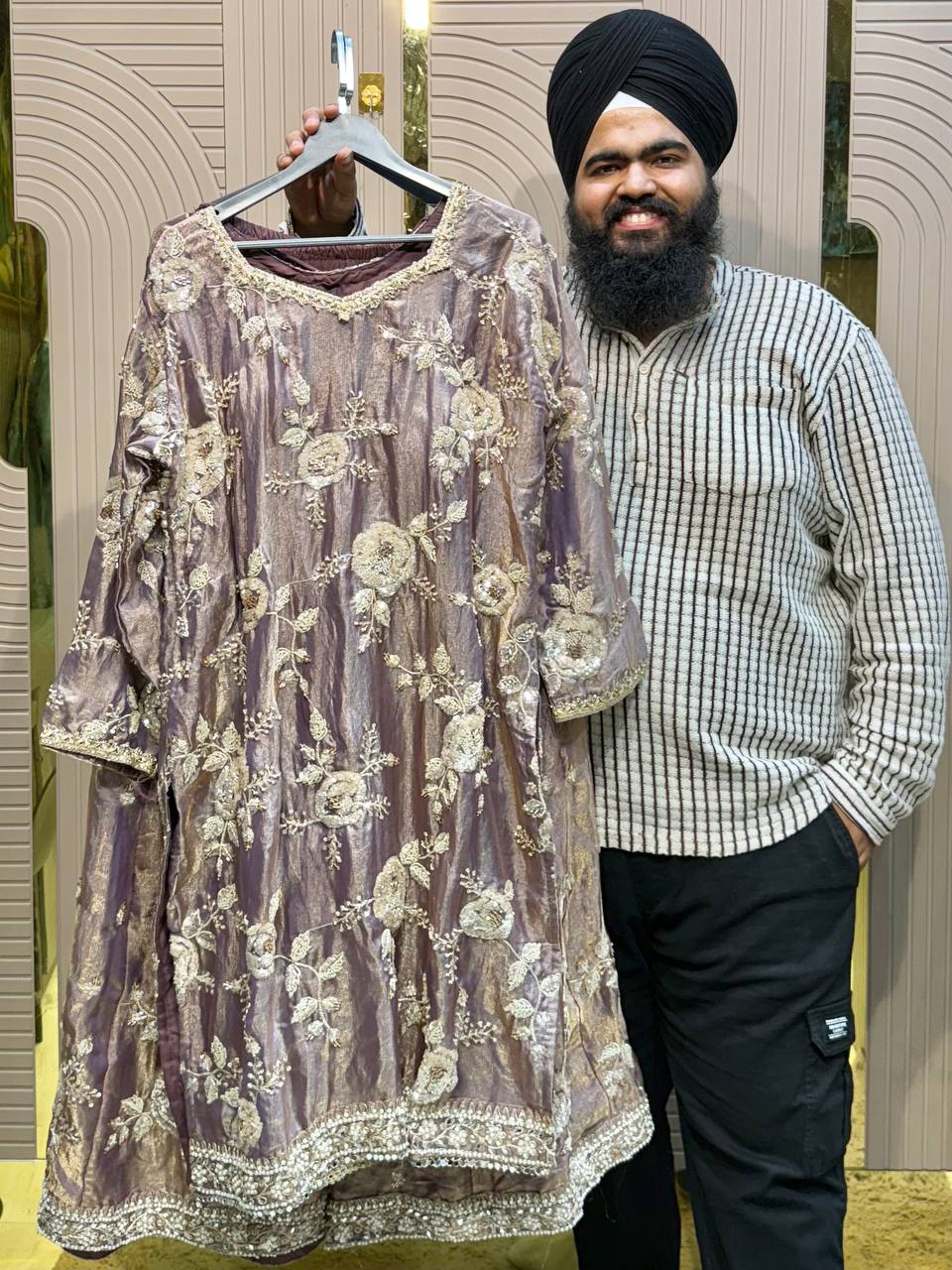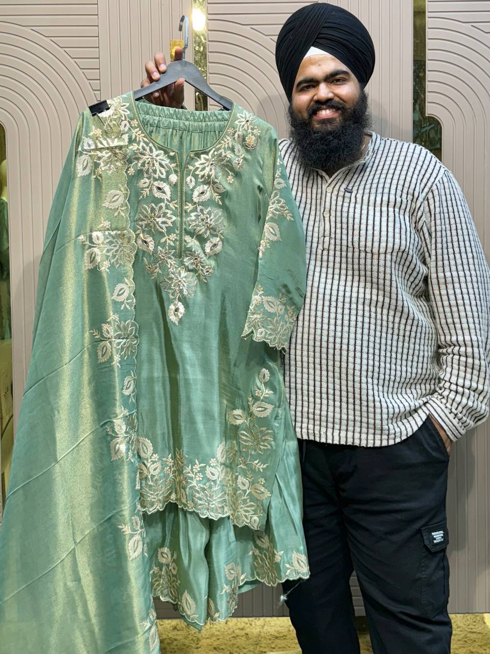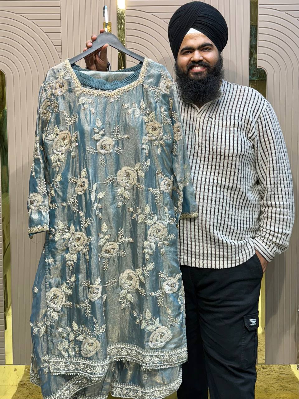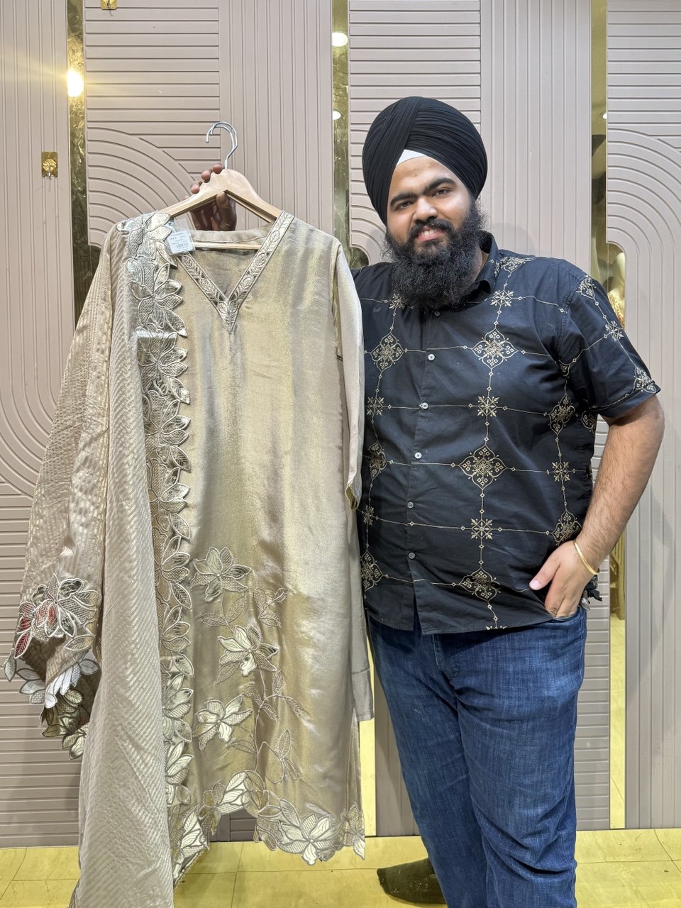 Glass Tissue Fabric Unstitched Suit ek soft, graceful aur luxurious ethnic creation hai, jo delicate glass tissue fabric par beautifully crafted applique work shirt aur dupatta ke saath design kiya gaya hai ✨👗