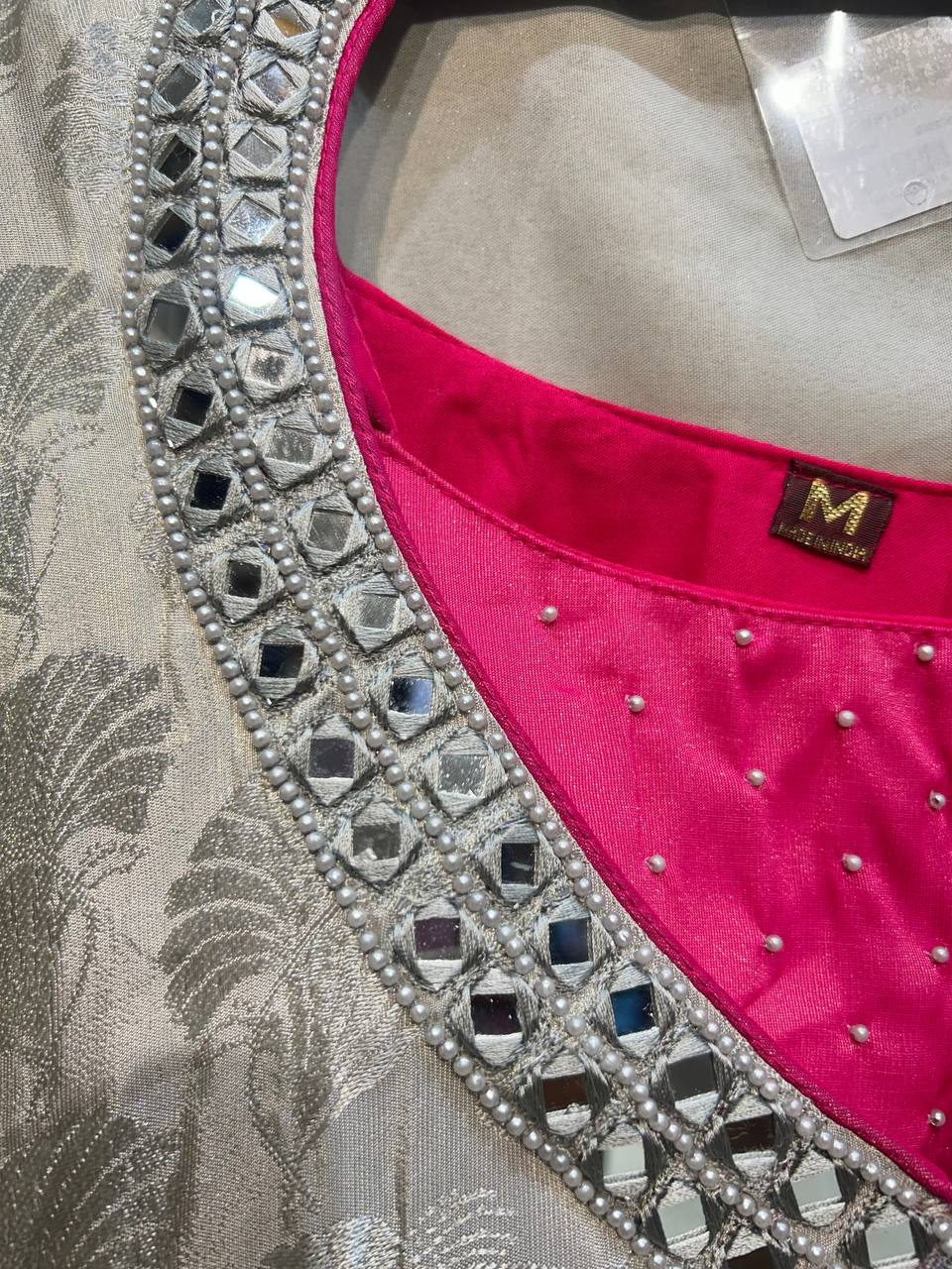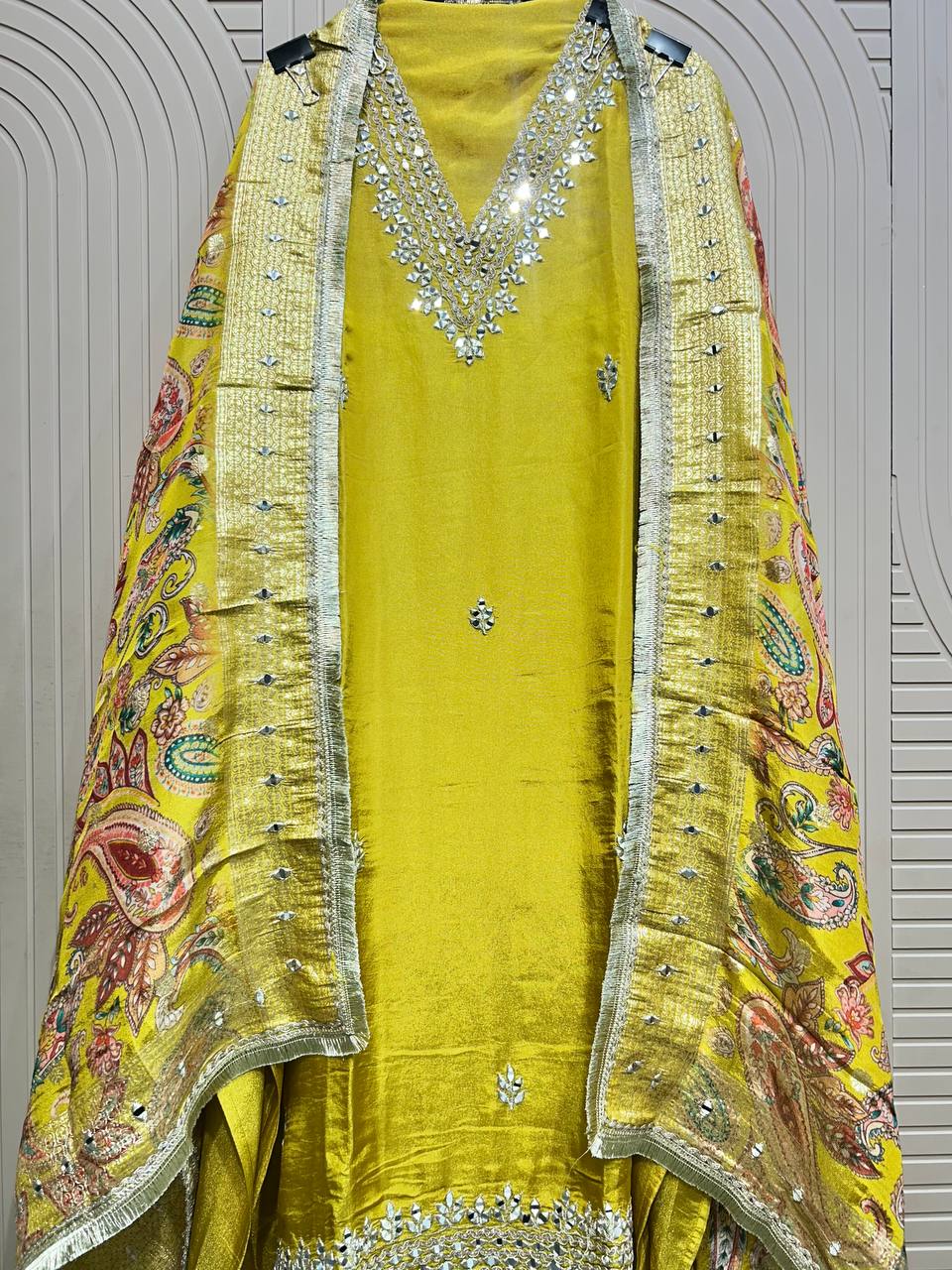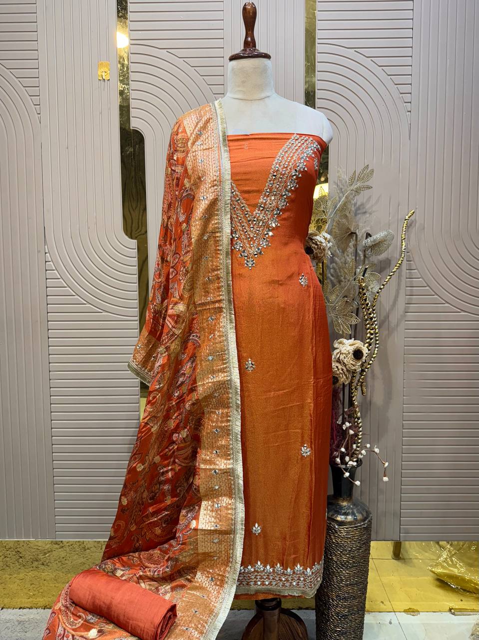 Heavy Maharani Dupatta Unstitched Suit Setek royal aur luxurious ethnic creation hai, jo premiumshimmer fabricpar elegantgota & mirror work neck designke saath aata hai ✨👑
