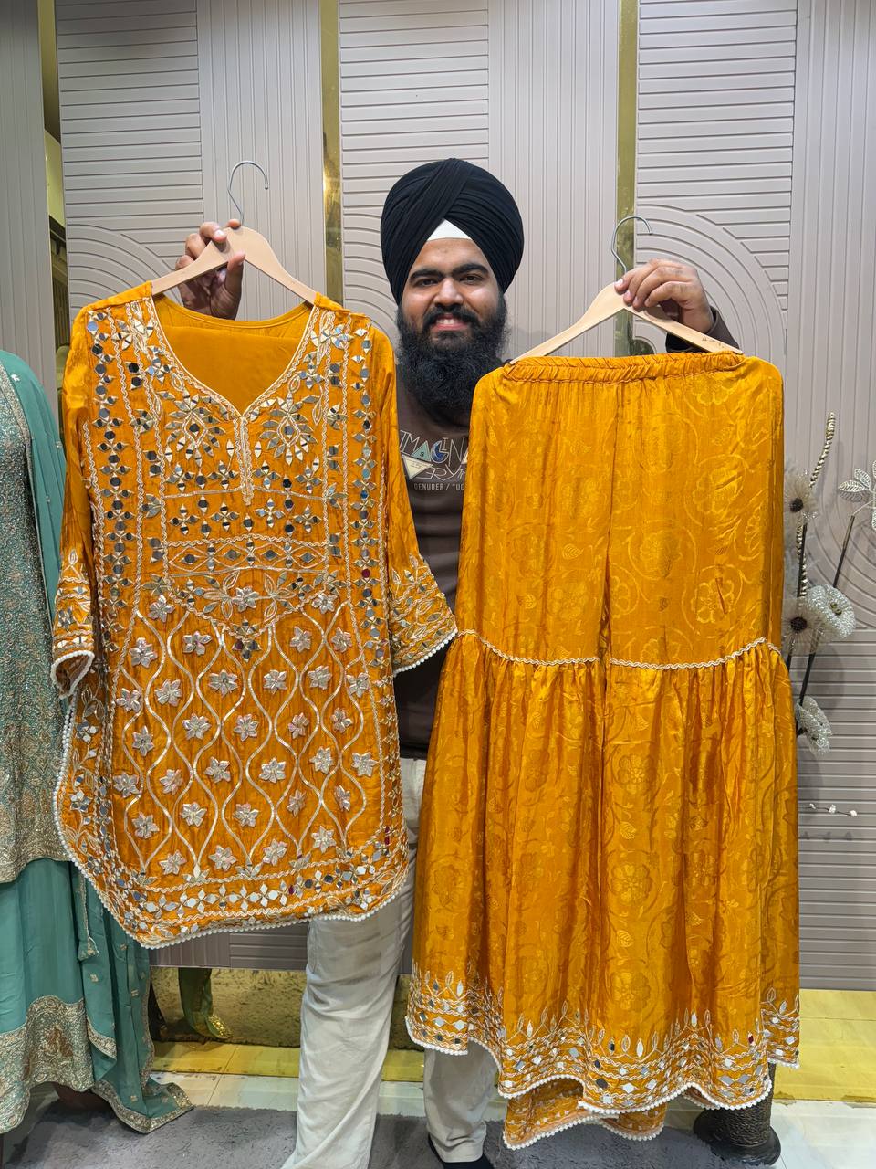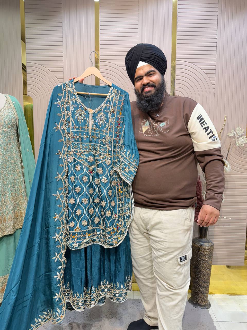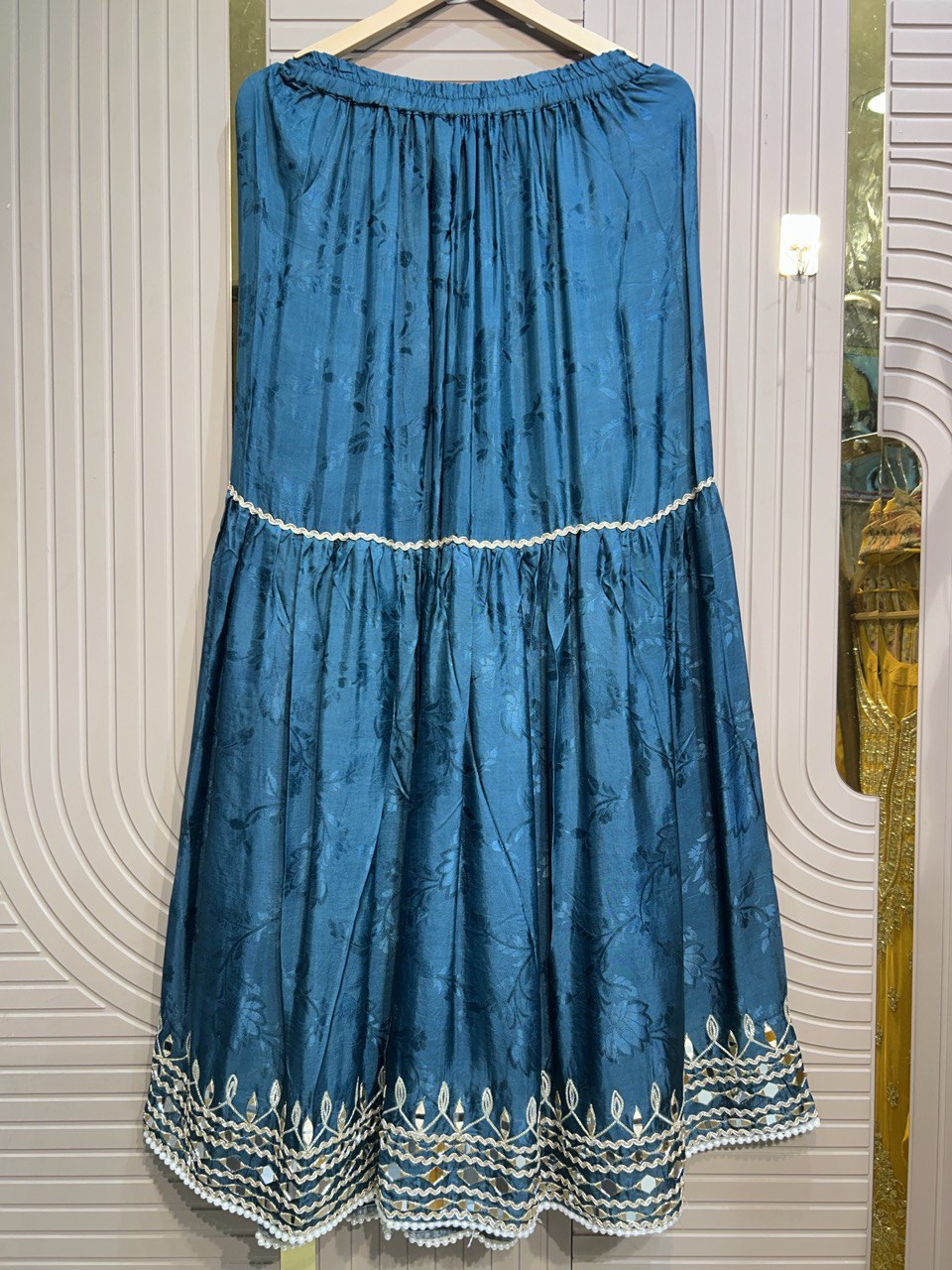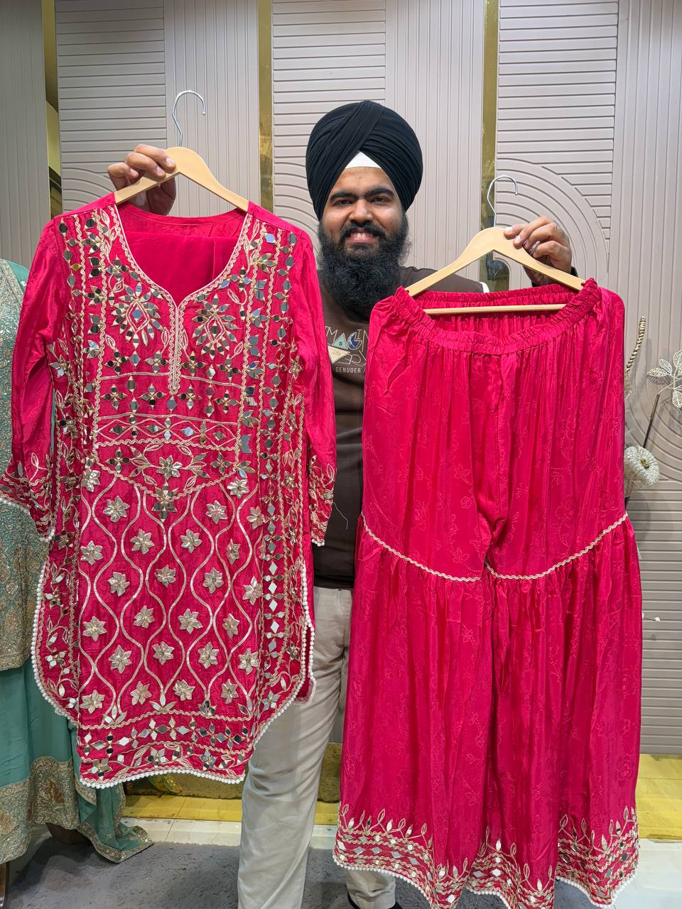 Heavy Maharani Dupatta Unstitched Suit Setek royal aur luxurious ethnic creation hai, jo premiumshimmer fabricpar elegantgota & mirror work neck designke saath aata hai ✨👑