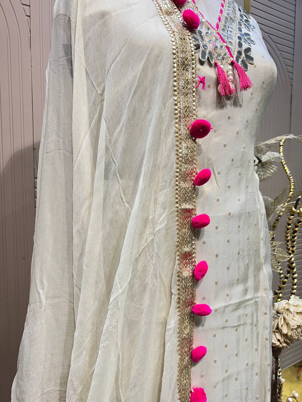 Mirror Work Polka Dotted Unstitched Suit with Pom-Pom Dupatta