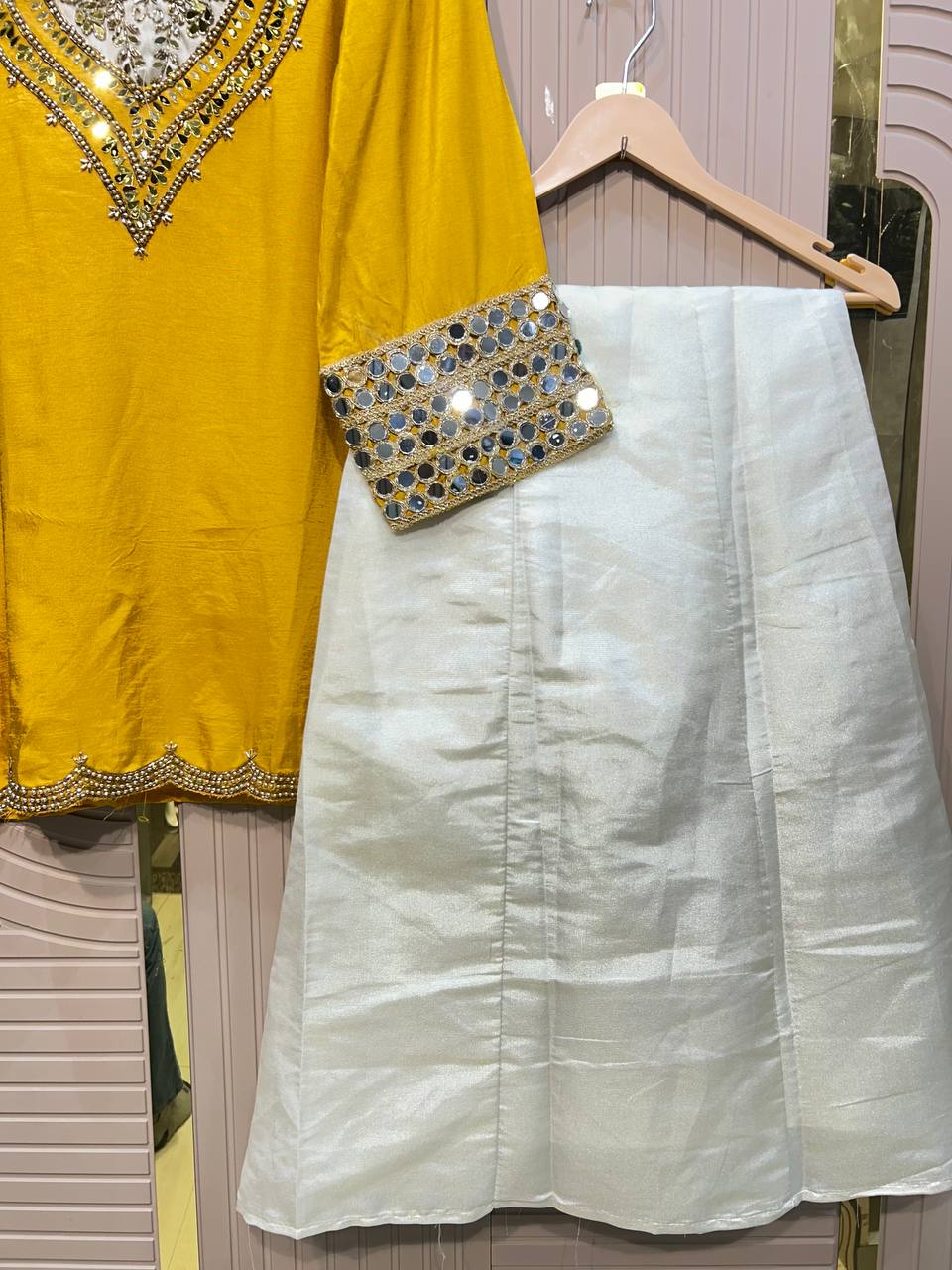 Short apple cut sharara set with elegant mirror work