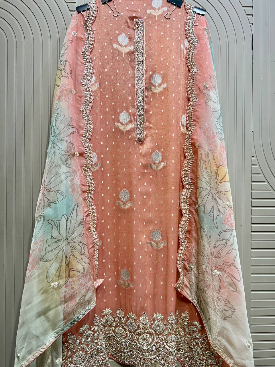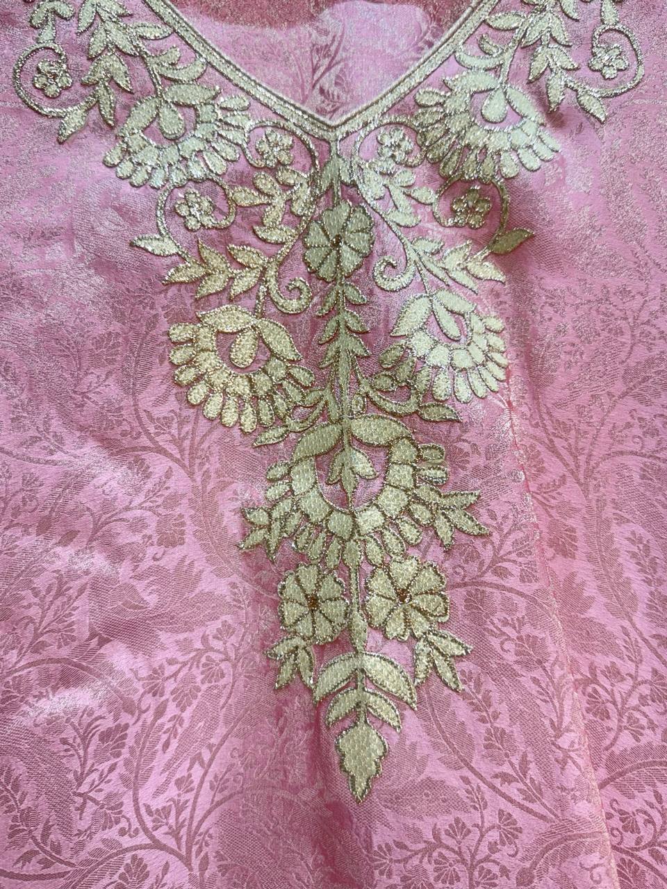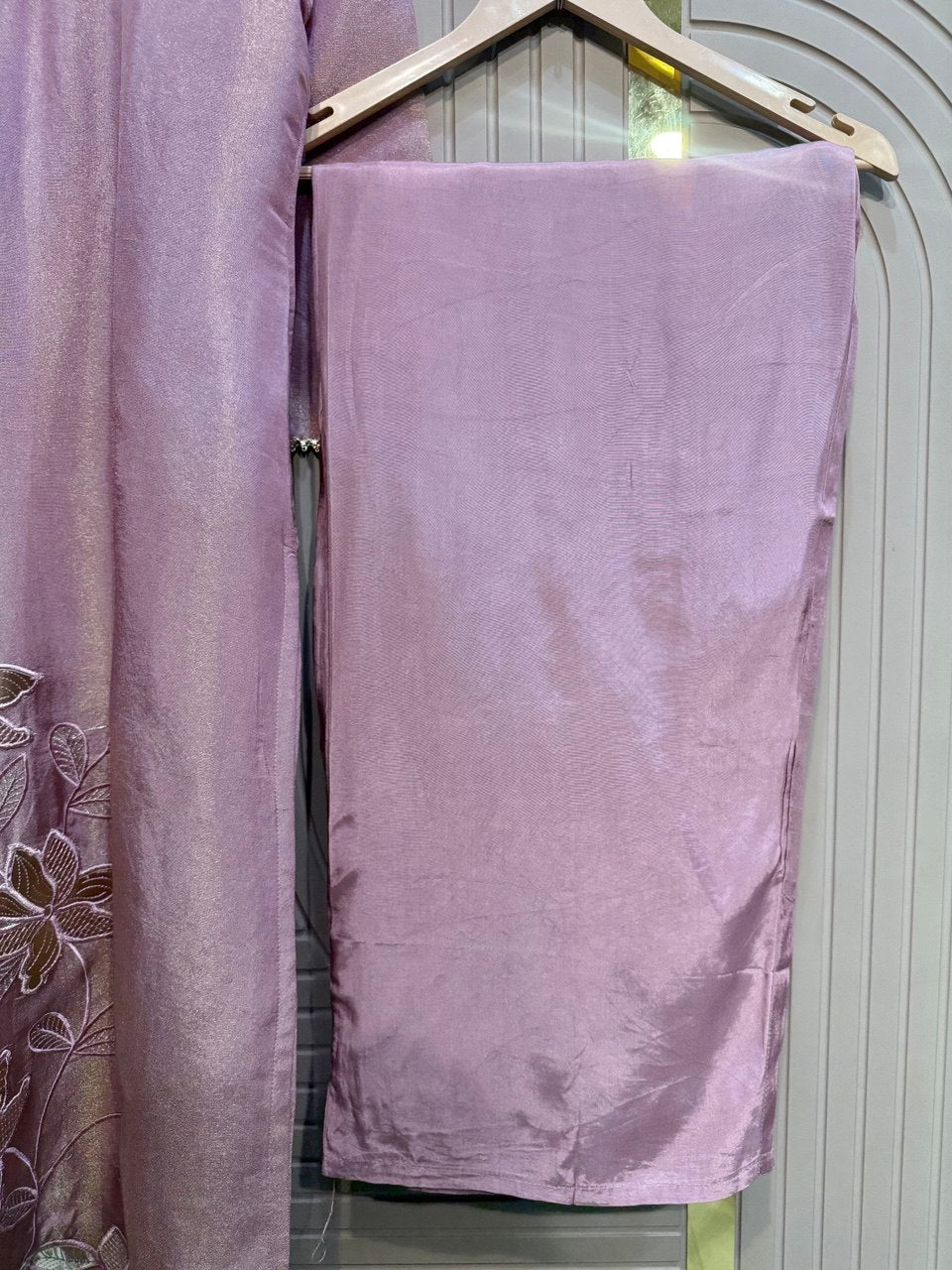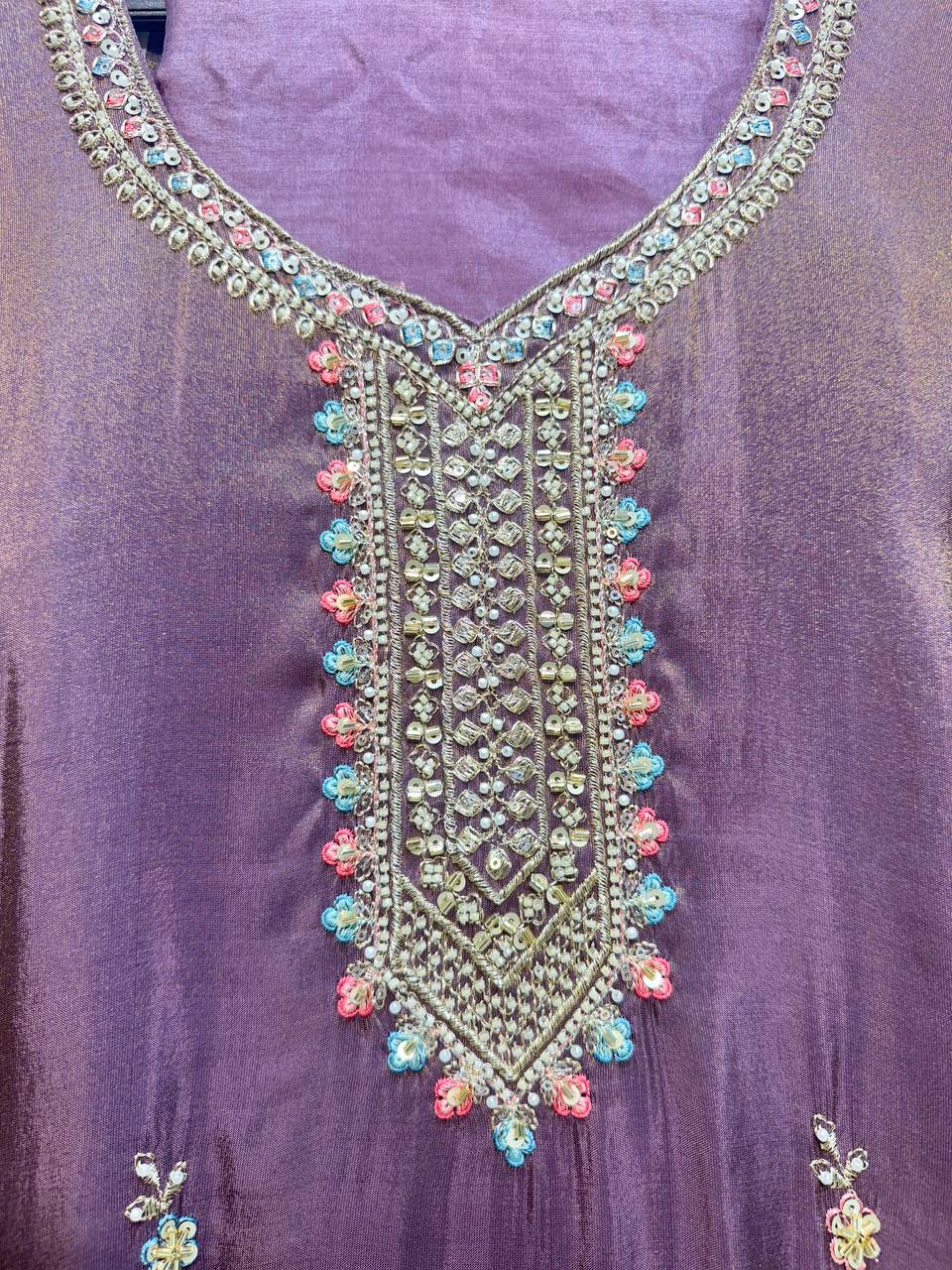 Glass Tissue Fabric Unstitched Suit ek soft, graceful aur luxurious ethnic creation hai, jo delicate glass tissue fabric par beautifully crafted applique work shirt aur dupatta ke saath design kiya gaya hai ✨👗