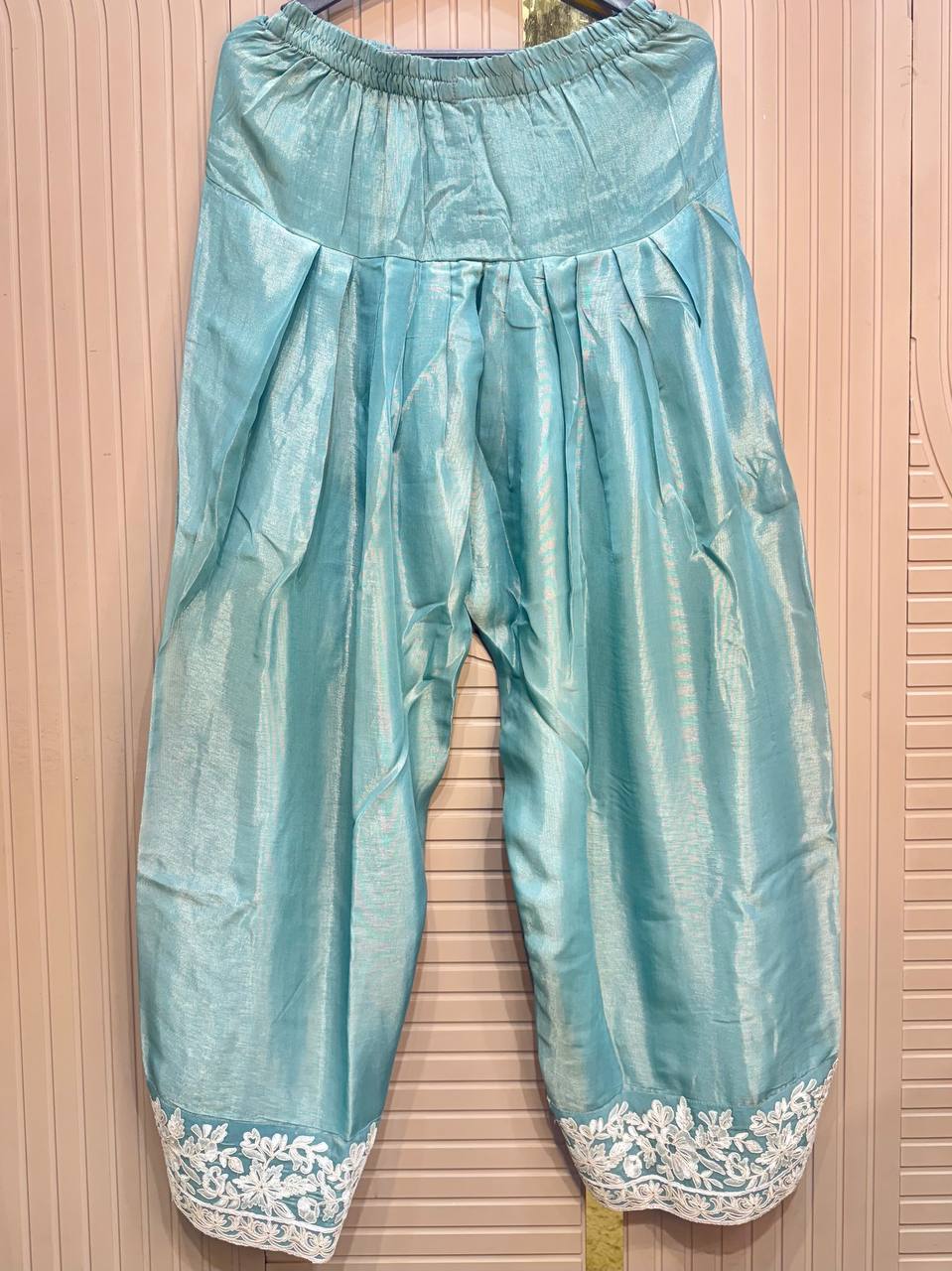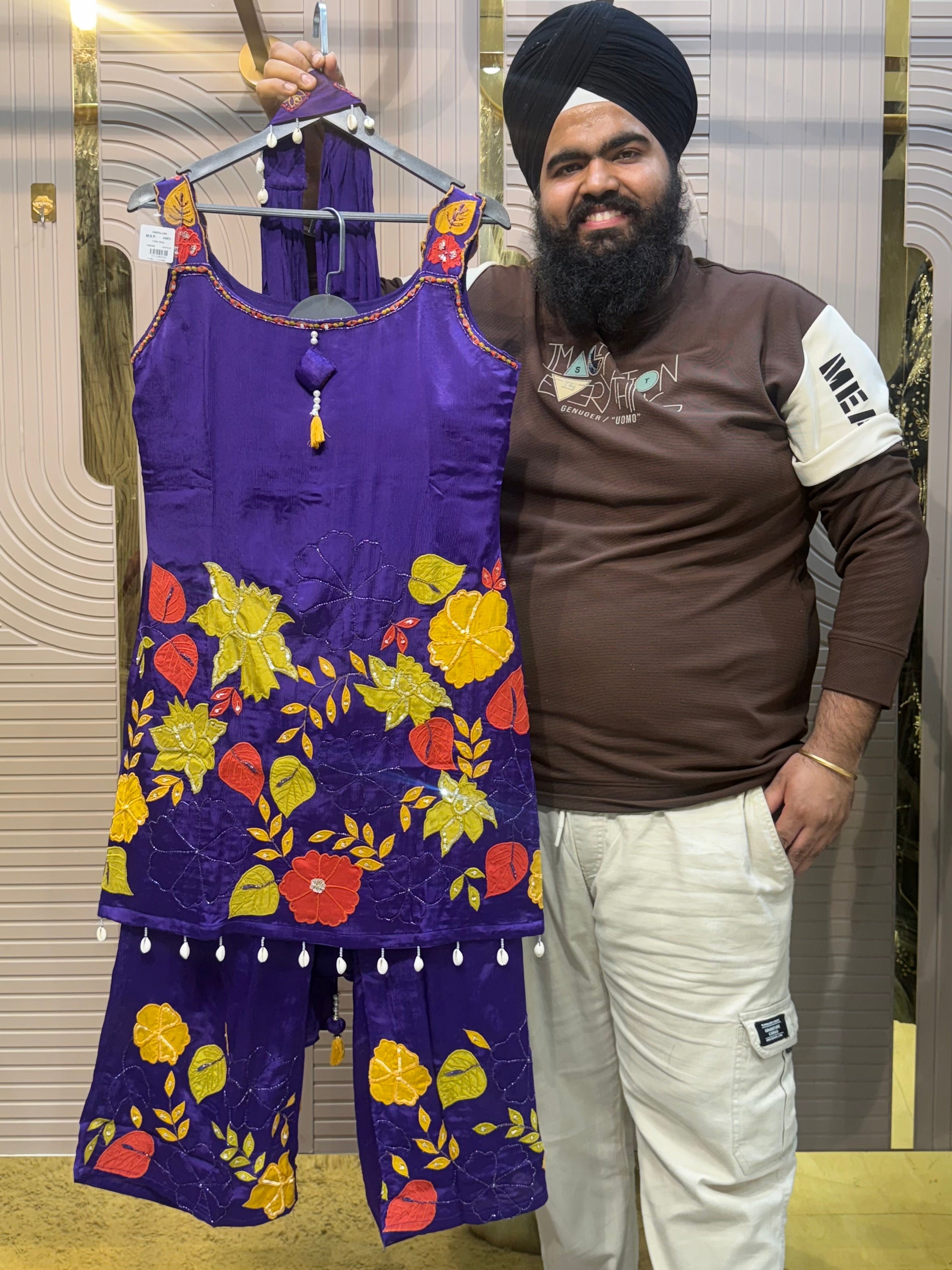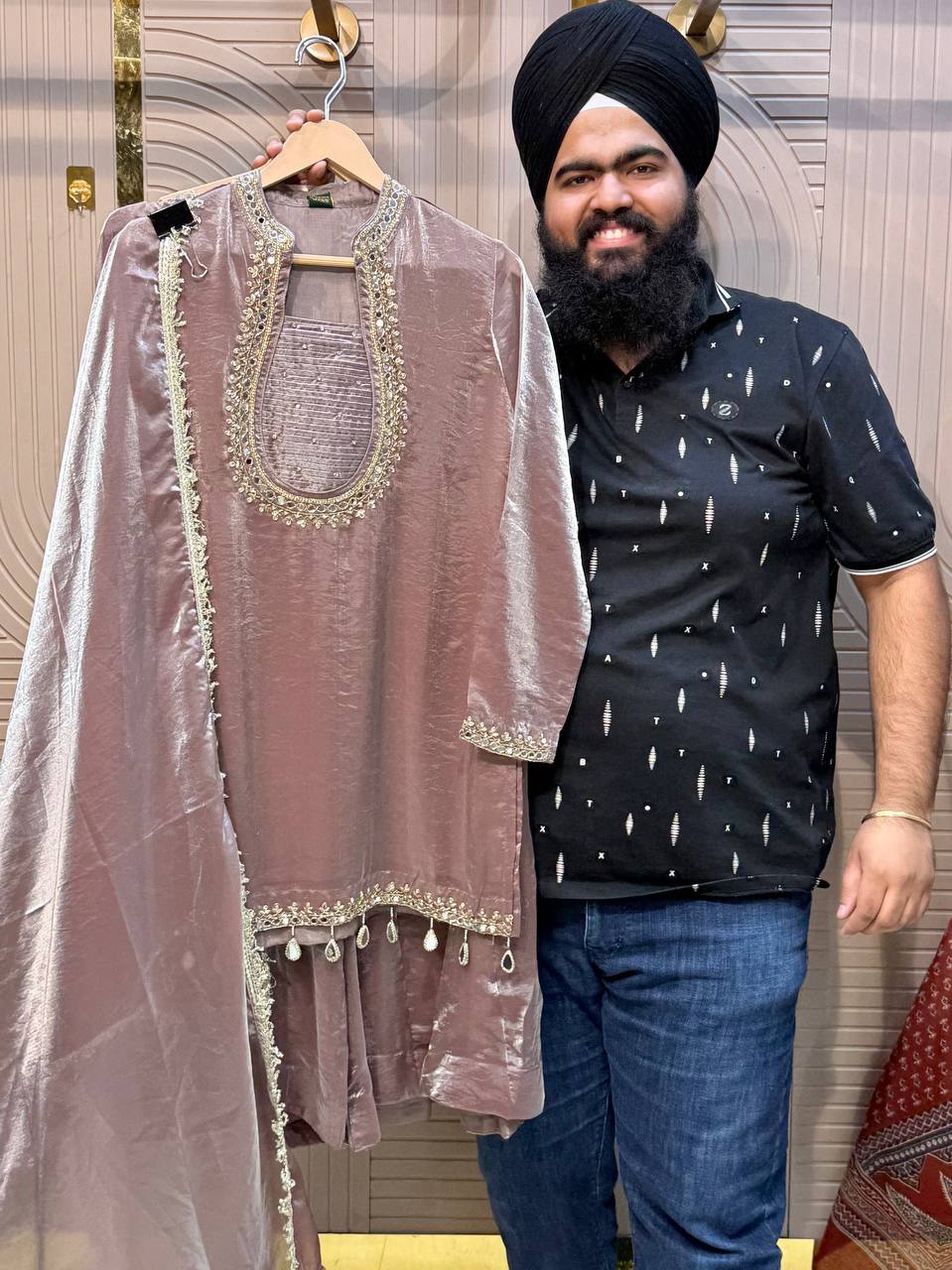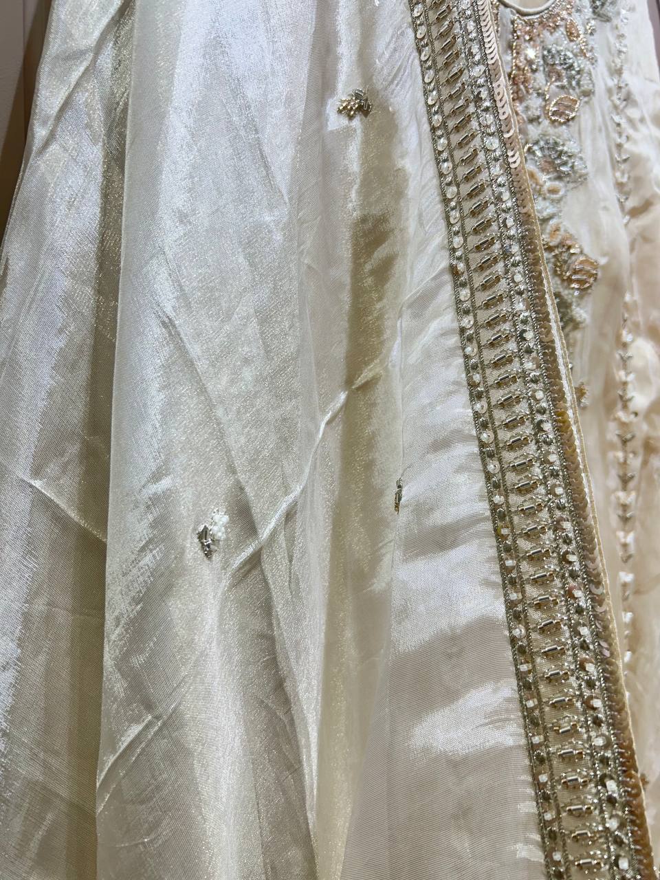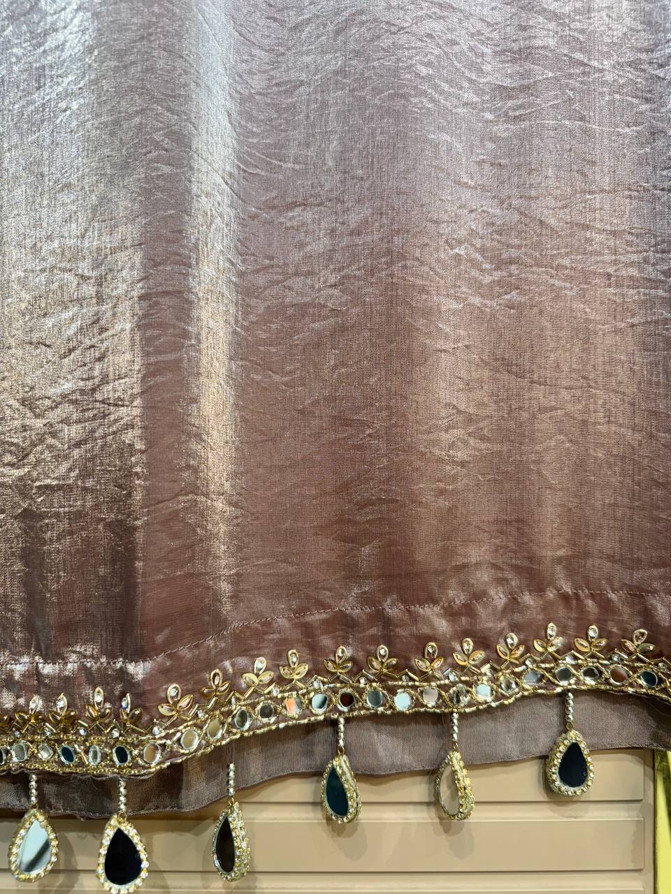 Glass Tissue Fabric Unstitched Suit ek soft, graceful aur luxurious ethnic creation hai, jo delicate glass tissue fabric par beautifully crafted applique work shirt aur dupatta ke saath design kiya gaya hai ✨👗