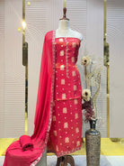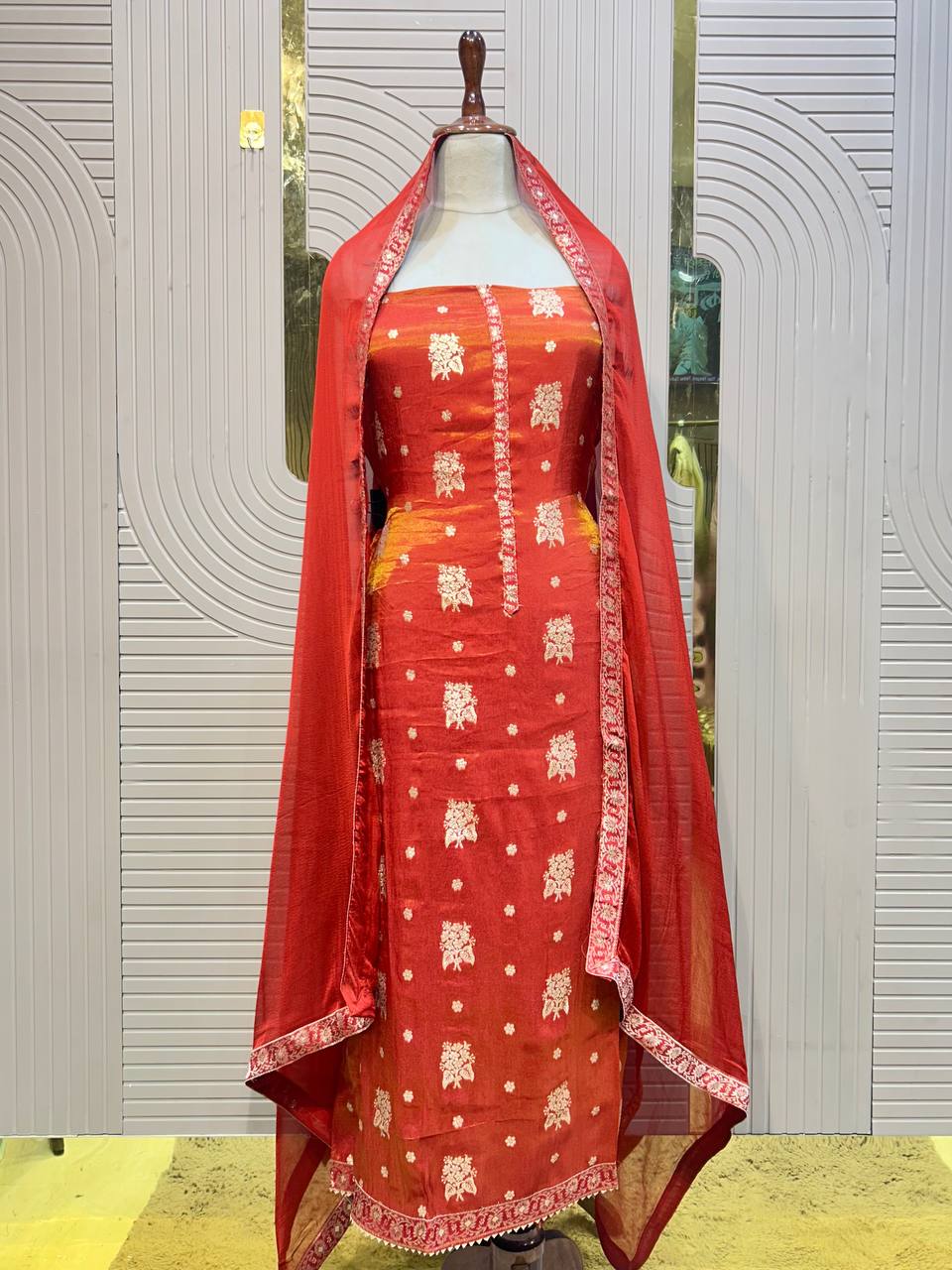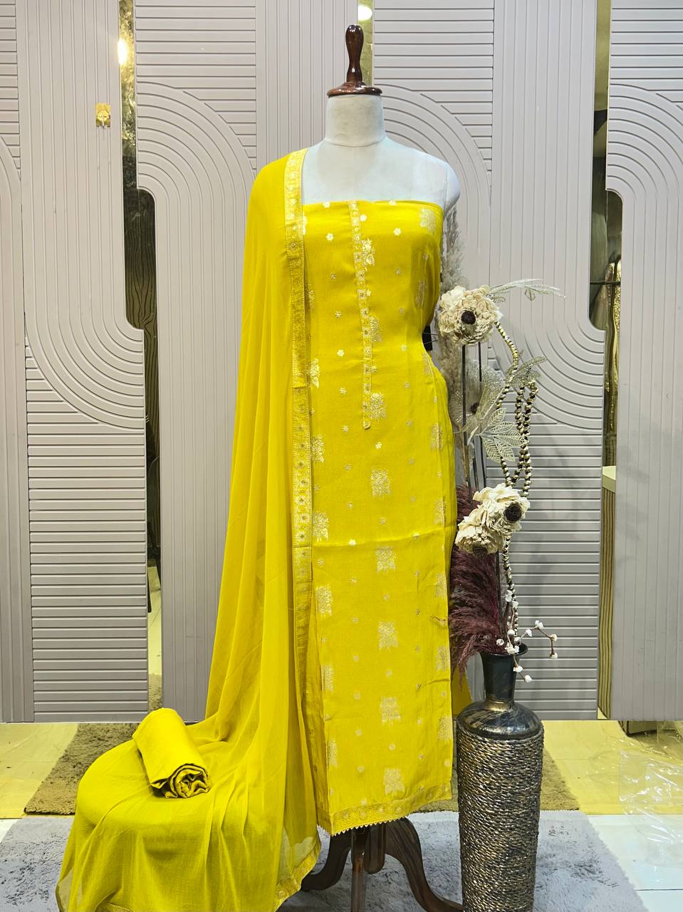 Is suit ke saath four-side bordered designer dupatta diya gaya hai, jo outfit ko royal finish aur graceful flow deta hai. Subtle shine aur clean detailing is unstitched suit ko weddings, festivals aur special occasions ke liye perfect banati hai.